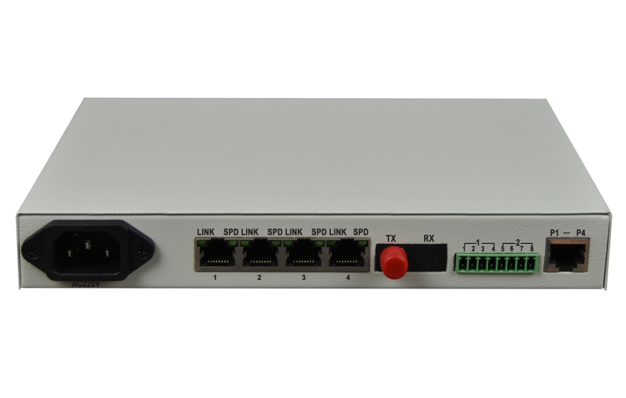 The Equipment supports 4*100M Ethernet +4*Voice+ 2*RS232/422/485/Dry contact  interface to the optical fiber converter to achieve network + telephone + serial data + Dry contact 4 type interface in the same core Optical fiber transmission is widely used in a variety of industrial control card instrumentation and other occasions not only save fiber resources but also save fiber equipment reduce the point of failure to facilitate the maintenance of equipment. 4*100M Ethernet interface bandwidth for the wire speed 100M the Ethernet interface on the market are generally 10M /50M or <100M speed;