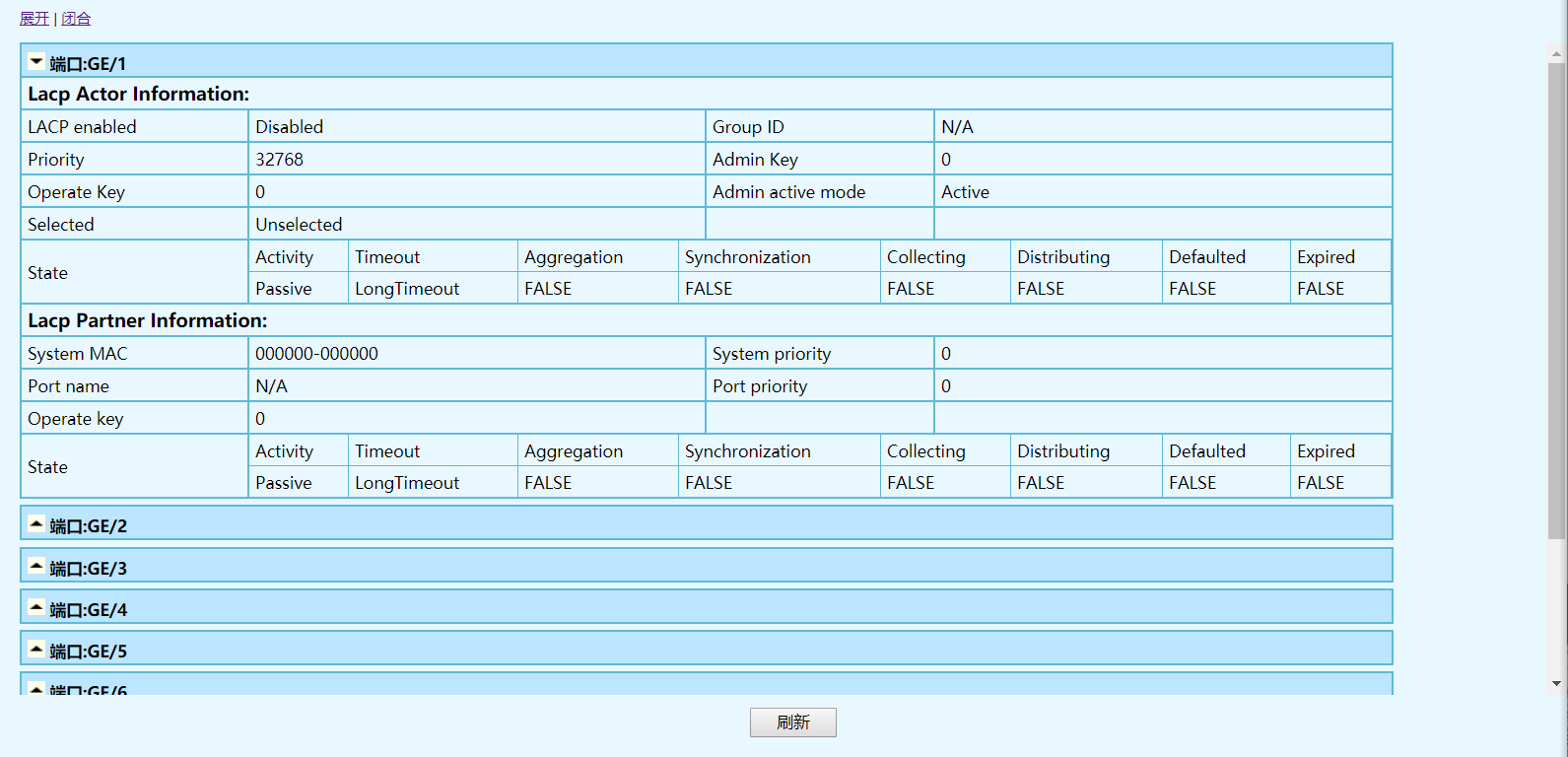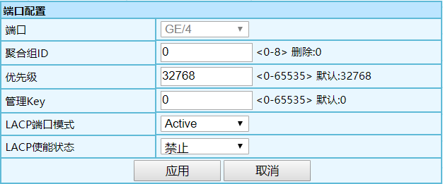 端口的 LACP 使能狀態(tài): 使能:開(kāi)啟端口的 LACP。 禁止:關(guān)閉端口的 LACP。注:端口默認(rèn)為禁止?fàn)顟B(tài)。 |