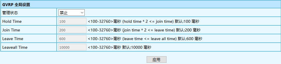 GVRP全局使能開(kāi)關(guān)。 使能:使能GMRP功能; 禁止:關(guān)閉GMRP功能。注意:默認(rèn)關(guān)閉。 |