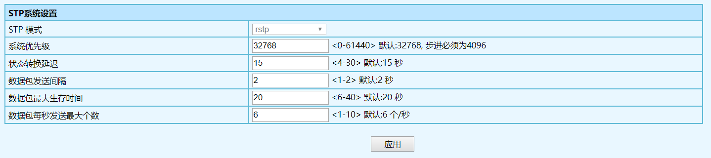 | STP 模式 | 當(dāng)前的 STP 模式,支持 RSTP,兼容 STP |