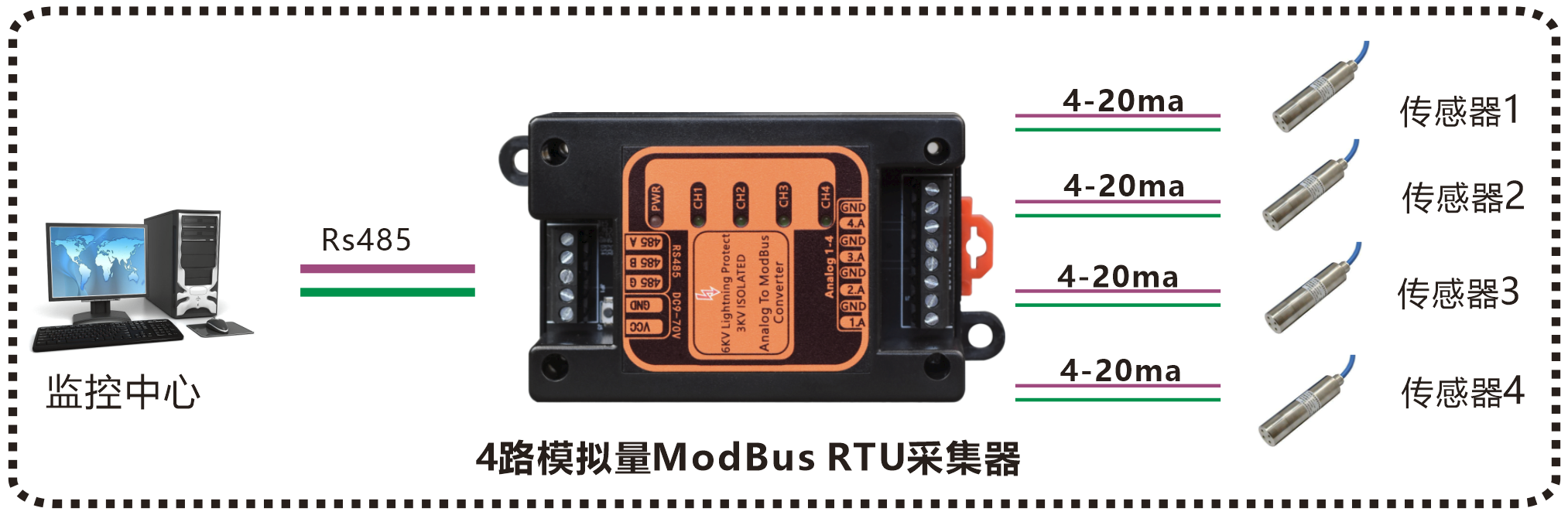 | 產(chǎn)品功能描述 | 工業(yè)軌式 4路0-20MA/4-20MA/0-10V/0-5V模擬量Modbus RTU采集器 |