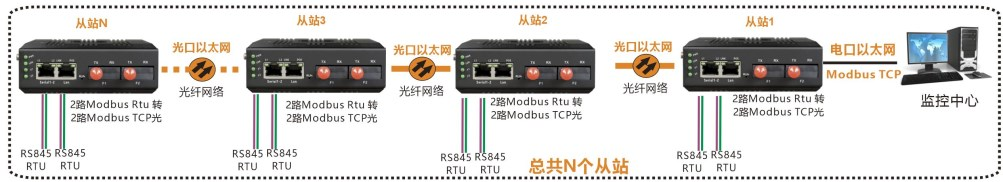 可光纖級(jí)連型 2 路 RS232/422/485 串口服務(wù)器,2 路光以太+1 路電以太,工業(yè)軌式