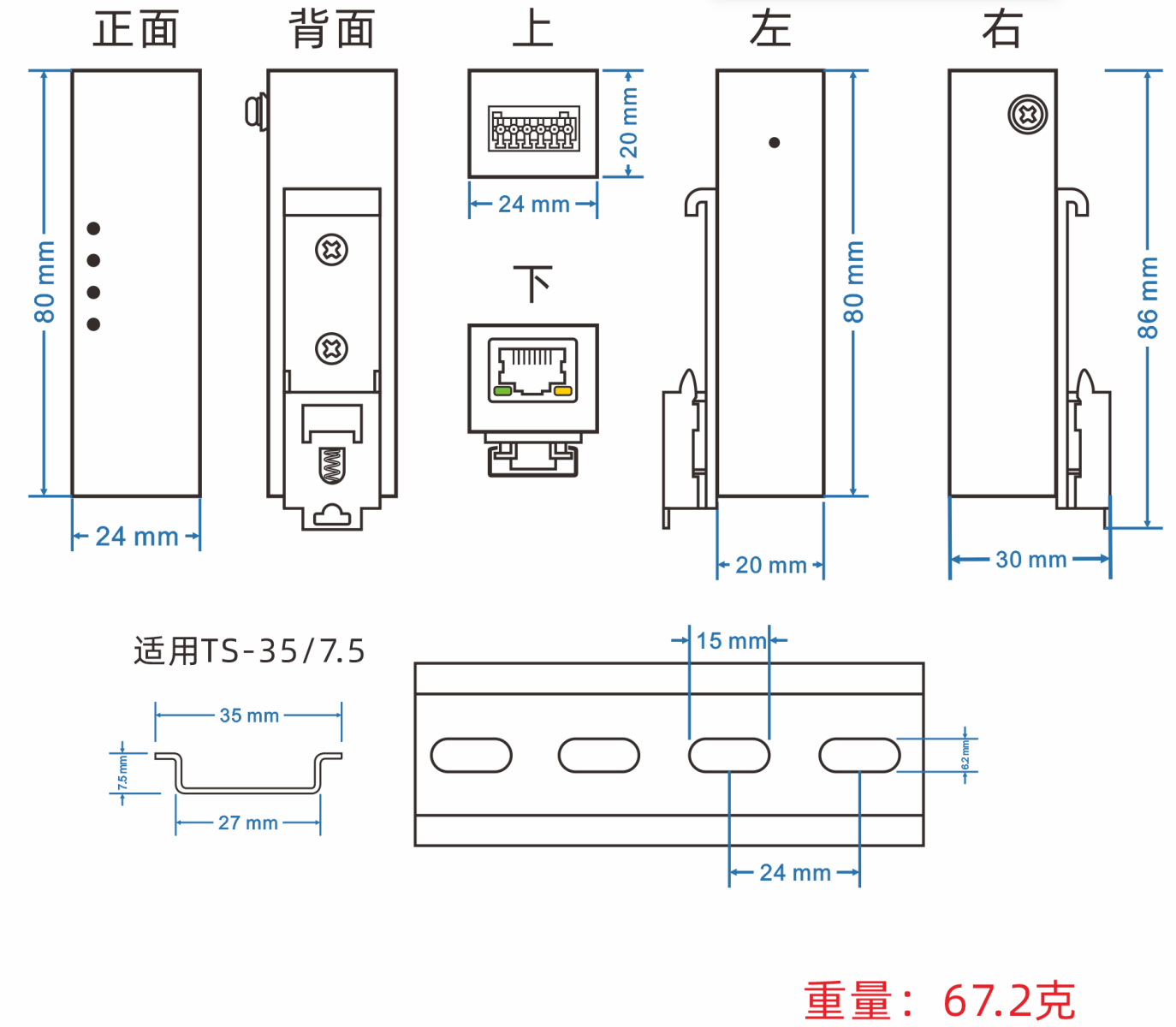尺寸:24mm(長) x 80mm(寬) x 20mm(高) 安裝方式:35mm導軌安裝、壁掛式安裝 |