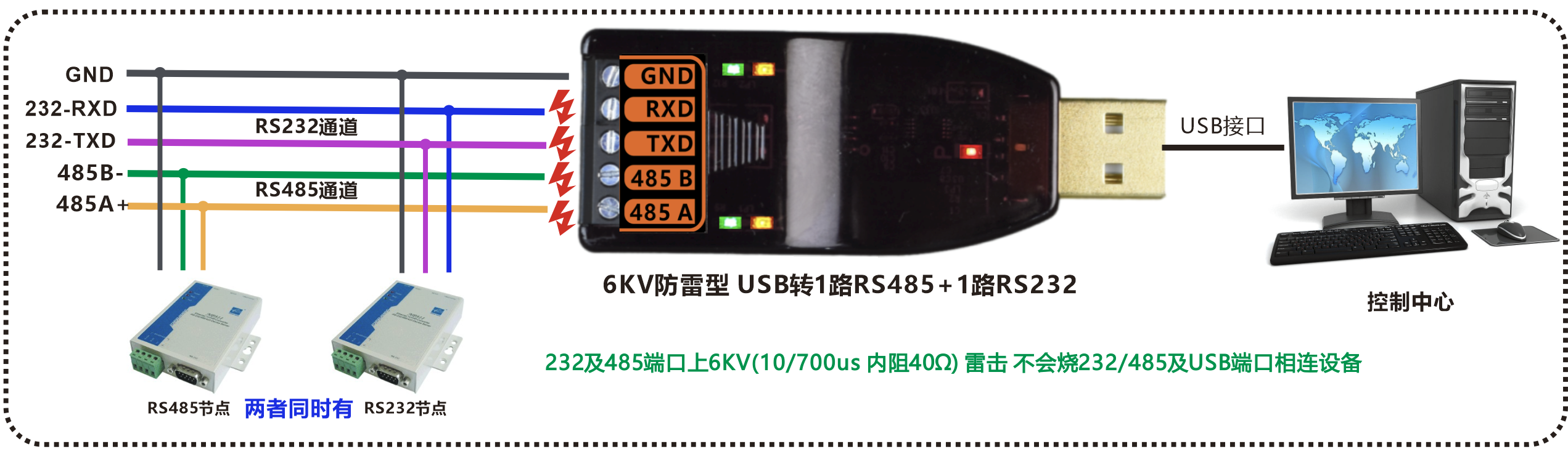 | 產(chǎn)品功能描述 | 防雷型USB轉(zhuǎn)1路高速RS485+1路RS232轉(zhuǎn)換器 |