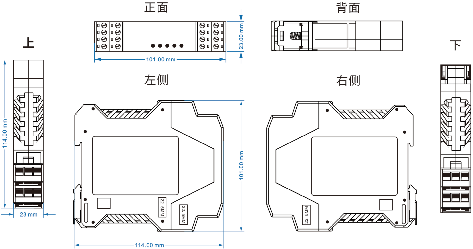 電源輸入DC9-70V ,功耗<1W 過載保護(hù):支持;反接保護(hù):支持; 接入端子:3芯5.08mm間距端子 |
