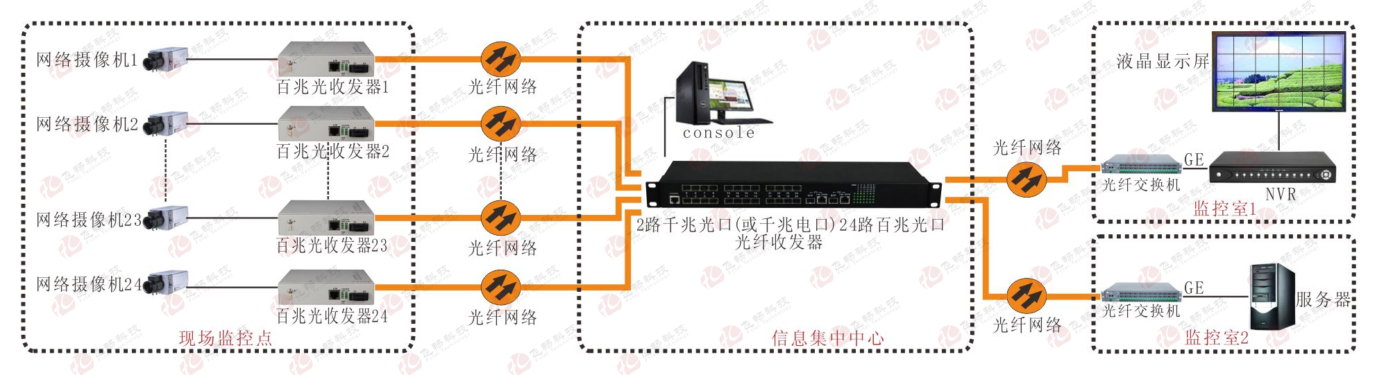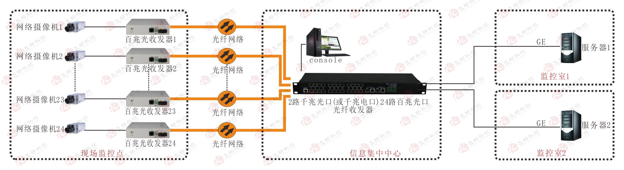 24+2光纖匯聚型交換機(jī)是一種用來將遠(yuǎn)端的24個(gè)光方向百兆光信號(hào)集中交換的光電信號(hào)交換機(jī)。