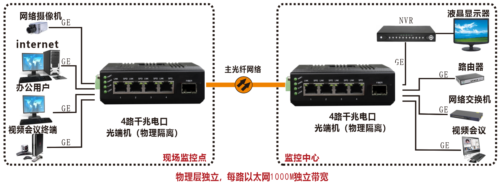 | 產(chǎn)品功能描述 | 1路10G SFP光口轉(zhuǎn)4*1000M物理隔離以太網(wǎng)電口,線速帶寬4*1000M |