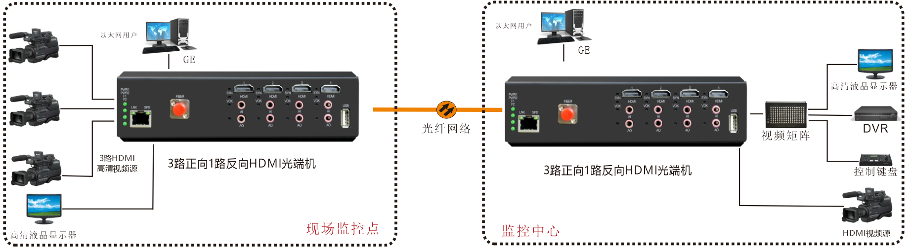 | 產(chǎn)品功能描述 | 在光纖上同時(shí)傳送4路2K HDMI 信號(hào) + 1路千兆以太網(wǎng)+1路USB1.1 |