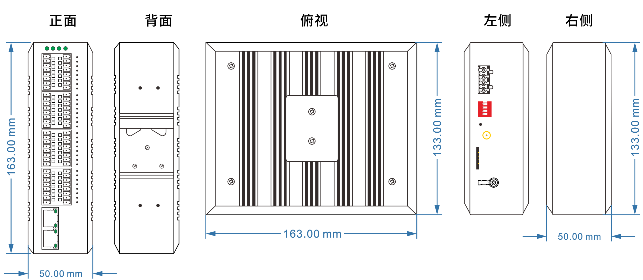外殼:IP40防護(hù)等級(jí),鋁合金材質(zhì) 尺寸:162mm(長(zhǎng)) x 132mm(寬) x 50.0mm(高) 裝方式:導(dǎo)軌安裝、壁掛式安裝 |