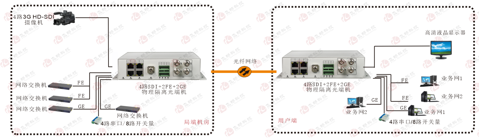 | 產(chǎn)品功能描述 | 在光纖上同時傳送4路3G HD-SDI視頻,1-8路開關(guān)量接口/1-4路RS232-422-485接口;2路千兆以太網(wǎng)(物理隔離),2路百兆以太網(wǎng)(物理隔離) |